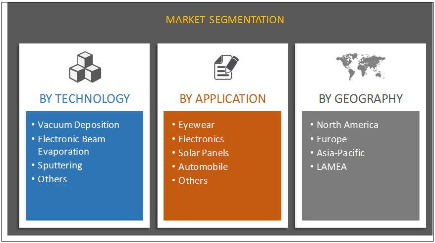 The global antireflective coatings market is segmented based on technology, geography, and application. On the basis of technology, the market is categorized into vacuum deposition, electronic beam evaporation, sputtering, and others (ion assisted deposition). Antireflective coatings market application covered in the study include eyewear, electronics, solar panels, automobile, and others (telecommunications, telescope, and binocular lenses).