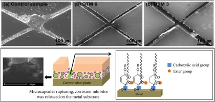 Renewable polyurethane microcapsules based on a dimer-acid-based polyol were prepared through interfacial polymerization with a homogenizer and sonicator. The dimer-acid-based polyol was used to produce a dimer ester-toluene diisocyanate prepolymer by reacting with toluene 2,4-diisocyanate (TDI). Then, the dimer ester-toluene diisocyanate prepolymer was reacted with 1,4-butanediol (BD) in order to form the shell of the microcapsules, which contained triazole- and oleate-derivative corrosion inhibitors as core materials for anticorrosion effects in coating systems. The resultant microcapsules using a homogenizer (DTM) and a sonicator (DSM) consisted of the anticorrosion agent core and renewable polyurethane shell, and were prepared under controlled optimum conditions (2000–8000 rpm, 500 W). Specific core contents were approximately 47–58%, and the ratios of the shell thicknesses to the capsule diameters were approximately 0.08. The anticorrosion properties of the self-healing coatings based on smart microcapsules were investigated on scratched panels using the salt spray test. The scratch test revealed that the self-healing coating system had significant ability to prevent corrosion growth. Anticorrosion coating surfaces with functionalized smart microcapsules did not corrode so notably that the corrosion-resistance effect, as the rusting degree, was attenuated by the salt spray, and the rusting degree of the self-healing microcapsules increased to 0.045% of the panel area.