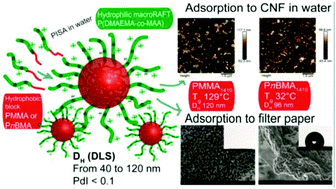 Latex nanoparticles comprising cationically charged coronas and hydrophobic cores with different glass transition temperatures (Tg) have been prepared by surfactant-free, RAFT-mediated emulsion polymerization, where the particles form through a polymerization-induced self-assembly (PISA) type mechanism. Poly(2-dimethylaminoethyl methacrylate-co-methacrylic acid) (P(DMAEMA-co-MAA)) was utilized as a hydrophilic macroRAFT agent for the polymerization of methyl methacrylate (MMA) or n-butyl methacrylate (nBMA), respectively, resulting in two different latexes, with either a core of high (PMMA) or low (PnBMA) Tg polymer. By varying the molar mass of the hydrophobic block, latexes of different sizes were obtained (DHca. 40–120 nm). The adsorption of the latexes to cellulose model surfaces and cellulose nanofibrils (CNF) was studied using quartz crystal microbalance with dissipation monitoring (QCM-D). The surfaces with adsorbed PnBMA latexes yielded hydrophobic surfaces both before and after annealing, whereas surfaces with adsorbed PMMA latex became hydrophobic only after annealing, clearly showing the influence of the Tg of the core. The latexes were also used to modify macroscopic cellulose in the form of filter papers. Similar to the CNF surfaces, no annealing was required to achieve hydrophobic surfaces with PnBMA latexes. Finally, nanocomposites of CNF and the polymer nanoparticles were prepared through a one-pot mixing procedure. It was found that the largest synthesized PMMA latex (120 nm) facilitated a more strainable CNF network at 50% relative humidity, with a nearly 200% increase in strain at break compared to the neat CNF reference film as well as to the composite films with PnBMA latexes or to the smaller sized PMMA latexes. This difference was attributed to the spherical shape and rigidity of the large PMMA latex nanoparticles during composite formation. This highly interesting result should indeed be considered in the future design of novel biocomposites.