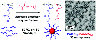 The environmentally-friendly synthesis of epoxy-functional spherical nanoparticles has been achieved using polymerization-induced self-assembly (PISA) in aqueous solution. Firstly, a non-ionic hydrophilic stabilizer block, poly(glycerol monomethacrylate) (PGMA), was prepared by reversible addition–fragmentation chain transfer (RAFT) solution polymerization in ethanol. This water-soluble precursor was subsequently chain-extended via RAFT aqueous emulsion polymerization of glycidyl methacrylate (GlyMA) at 50 °C and neutral pH to ensure maximum retention of the epoxy functionality. PISA leads to the formation of well-defined PGMA-PGlyMA spherical diblock copolymer nanoparticles at up to 35% w/w solids and 1H NMR spectroscopy studies indicated that virtually all of the epoxy groups survive such relatively mild conditions. DMF GPC studies confirmed that relatively low dispersities (Mw/Mn < 1.30) were obtained if the mean degree of polymerization of the core-forming PGlyMA block remained below 100. Well-defined triblock copolymer nanoparticles could also be prepared via seeded RAFT emulsion polymerization of n-butyl methacrylate, with DMF GPC analysis indicating a relatively narrow molecular weight distribution (Mw/Mn < 1.20). The epoxy groups within the nanoparticle cores were ring-opened by adding sodium azide to a 10% w/w aqueous copolymer dispersion at 50 °C, as confirmed by FT-IR spectroscopy. PGMA45-PGlyMA100 diblock copolymer nanoparticles could be conveniently converted into cationic nanogels by utilizing water-soluble diamines as crosslinkers. These nanogels were characterized by DLS and aqueous electrophoresis and remained intact when dispersed in DMF; in contrast, the corresponding linear precursor nanoparticles dissociated to form molecularly-dissolved copolymer chains under the same conditions.