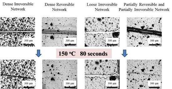 The thermally-induced self-healing behavior of polymer coatings consists of two steps, i.e., gap closure and crack repair. In addition, the polymer coatings with thermally-induced self-healing capability are expected to show satisfied properties to ensure the application. Here, four epoxy coatings with dense irreversible Network I, dense reversible Network II based on a Diels–Alder (DA) reaction, loose irreversible Network III, as well as partially irreversible and partially reversible Network IV were prepared, respectively. The dense irreversible Network I showed an evident gap closure upon heating, while the crack still existed at the high temperature. The dense reversible Network II presented good self-healing upon direct heating at a high temperature of 150 °C, leading to the quick gap closure in 40 s and subsequent crack disappearance in 80 s. The loose irreversible Network III showed negligible crack variations upon heating, while the partially reversible and partially irreversible Network IV showed quick gap closure as well but only partial crack disappearance. Besides, the coating with the reversible Network II based on the DA reaction not only presented good self-healing capability but also possessed the satisfied mechanical properties and the best electrochemical corrosion property, ensuring its further exploitation and potential practical applications