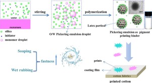 This paper presents a facile and efficient synthesis method to fabricate epoxy-acrylate copolymer/nano-silica latex via Pickering emulsion polymerization stabilized by silica sol. The effects of solid contents, silica concentration and polymerization time on emulsion polymerization were studied. The core-shell epoxy-acrylate copolymer/nano-silica was obtained with average diameter 690 nm, was observed by Transmission Electron Microscopy (TEM) and Dynamic Light Scattering (DLS). The formation mechanism of epoxy-acrylate copolymer/nano-silica emulsion polymerization was proposed through observing the morphology of latex particles at different polymerization time. Fourier Transformation Infrared (FT-IR) and Thermogravimetric Analysis (TGA) were used to study structure and thermostability of the composites. Morphology of the latex film was characterized by Scanning Electron Microscope (SEM). The results indicated that nano-silica particles existed in the composite emulsion and could improve the thermal stability of the film. The epoxy-acrylate copolymer/nano-silica latex was used as binder applied to cotton fabric for pigment printing. The application results demonstrated that Pickering emulsion stabilized by silica sol has good effects in the pigment printing binder without surfactant. Compared with commodity binder, the resistance to wet rubbing fastness and soaping fastness were improved half grade.