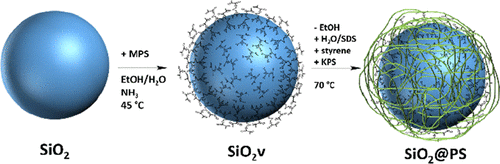 To prepare modified silica nanospheres for emulsion polymerization, a new agglomeration-free change of dispersion media has been developed. Nanosized silica spheres were synthesized by the Stöber method and directly modified with a silane coupling agent. To prepare these particles for subsequent polymerization, the dispersion medium was changed in a two-step process from ethanol to water without agglomeration of the particles. The emulsion polymerization leads to hemispherical single-core-structured silica–polystyrene composite particles. The thickness of the polymer shell can be altered by varying the amount of styrene. The developed change of dispersion media provides nonagglomerated modified silica particles for the encapsulation with polystyrene and enables the synthesis of narrowly distributed single-core composite particles. The developed process is a promising approach for the preparation of nanoparticles for subsequent polymerization and can be scaled-up for industrial applications.