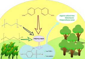 In this work, corn-based 100% renewable carbon poly(trimethylene ether glycol) (P3MG), biodegradable and biocompatible poly(ethylene oxide) (PEO), 4,4′-diphenylmethane diisocyanate (MDI) and sodium 2,4-diamino-benzenesulfonate (SDBS) were used to synthesize novel biobased waterborne poly(urethane-urea) (WPUU) dispersions following an environmentally-friendly process, which avoids the use of organic solvent. The particle size of WPUU dispersions were determined by dynamic light scattering. The molar ratio of PEO/P3MG polyols was varied to identify the WPUU dispersion with the optimum equilibrium between renewable content and final properties. Increase of P3MG content in polyol mixture led to smaller particle size, what could be related to the hydrophilic character of PEO. All investigated WPUU films were characterized by means of their physicochemical, thermal and mechanical properties, as well as their morphology by atomic force microscopy. Higher P3MG content in the WPUU films led to phase separation at the nanoscale, higher glass transition temperature and T1 endotherm temperature induced by the decrease in the hydrogen bonding between soft segment and hard segment. Moreover, higher P3MG content also resulted in higher modulus and elongation at break of the WPUU films. The present work highlights that waterborne poly(urethane-urea) dispersions with promising properties can be successfully prepared without using any catalyst and organic solvent.