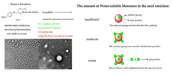 High solid content waterborne polyurethane-acrylate (WPUA) emulsions have been successfully synthesized in two steps. Firstly, we prepared a waterborne polyurethane emulsion, then reacted it with acrylate monomer by emulsion polymerization using the semi-continuous seeded method. The effects of the type and amount of emulsifier, the amount of dimethylolpropionic acid (DMPA), the choice of capping group, the ratio of PU/PA, and the method of adding a water-soluble monomer to the properties of the composite emulsion were investigated. The reactive emulsifier replaced the traditional emulsifier and there were no metal ions introduced to the reaction, whether by the emulsifier or the initiator. Through a variety of tests, we proved that the prepared emulsion has the advantages of small particle size, narrow distribution, good stability, good performance of the film, and solid content of 46%.