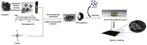 A novel antistatic anticorrosion composite coating was designed. The conductive core-shell straticulate structured silica@graphene and antimony doped tin oxide (ATO) were introduced in the waterborne epoxy coating to significantly decrease electrical resistivity. Reduced graphene oxide (RGO)-encapsulated functionalized silica hybrids (f-SiO2@RGO) were fabricated from sodium borohydride reduction of electrostatically assembled f-SiO2@GO hybrids with the help of silane coupling agent. The morphologies, the corrosion resistance and the antistatic properties were investigated. In the ATO + f-SiO2@RGO/epoxy coating, the f-SiO2@RGO sheets were evenly dispersed in coating, forming unique core-shell straticulate structure that effectively prevented the penetration of electrolyte, and constructed a conductive network at the coating-tinplate. The results showed that the antistatic and the anticorrosive performances of ATO + f-SiO2@RGO/epoxy coating were significantly enhanced as compared with the addition of 5% other fillers in coating, which includes the same amount of ATO. This superior core-shell f-SiO2@RGO straticulate structure and ATO particles, with their prominent conductivity, can make full use of the enhancement effect of different components and thus endow waterborne epoxy coatings with outstanding corrosion resistance and antistatic properties overall.