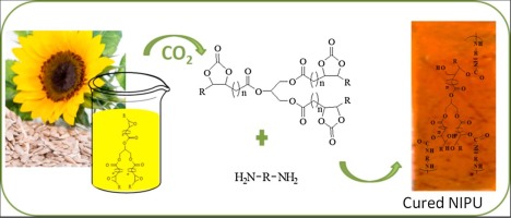 Bio-based Non-Isocyanate Polyurethanes (NIPUs) were synthesized by bulk polyaddition of diamine with carbonated sunflower oil (CSFO). Carbonated vegetable oils were obtained by solvent free mixture reaction of CO2 with epoxidized sunflower oil under the conditions (120 °C, 50 bar) and characterized by FTIR, 1H NMR, and 13C NMR. Finally, the effect of the amine structure as well as CSFO/amine molar ratio (1:0.75, 1:1 and 1:2) on mechanical, and chemical properties NIPU’s were studied by using curing agents EDA (1,2-ethylenediamine), DETA (Diethyltriamine) and IPDA (Isophorone diamine). Except for IPDA based NIPU, it was seen that along with urethane formation, the amine group also reacted with ester groups to form amides. IPDA and EDA showed good thermal, mechanical, chemical and anticorrosive properties. Furthermore, DETA based NIPU displayed high elongation at break. These results highlight the potentiality of this environmental friendly approach to prepare renewable NIPU materials for surface coatings purpose.
