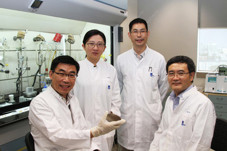 Image 3: The researchers from IBN, clockwise from left, Dr Guangshun Yi, Dr Yuan Yuan, Dr Xiukai Li and Dr Yugen Zhang, who developed the dragonfly-inspired nano coating that can kill bacteria spontaneously upon contact. Dr Yi is holding up a piece of zinc coated with zinc oxide nanopillars.