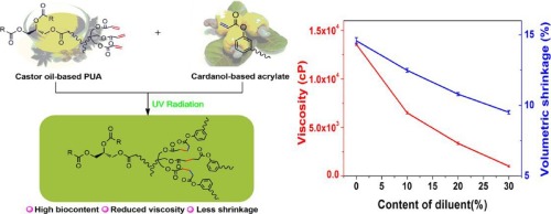 A biobased diluent, cardanyl acrylate (CA), was synthesized from cardanol and used to modify a castor oil-based polyfunctional polyurethane acrylate (PUA) resin. Firstly, chemical structure of CA was characterized by FT-IR, 1H NMR, and 13C NMR. Subsequently, the effect of CA’s content on the biobased content, viscosity, and volumetric shrinkage of the obtained bioresins were studied and compared with the petroleum-based hydroxyethyl acrylate (HEA) diluent. Moreover, ultimate properties of the UV-cured biomaterials such as thermal, mechanical, coating, swelling, and hydrophobic properties were investigated. Finally, UV-curing kinetics of the resulting bioresins were determined by real-time IR. By the addition of CA, the biobased content of the resulting bioresins were improved and the viscosity and volumetric shrinkage were reduced. For example, the obtained bioresin containing 30% of CA possessed a biobased content of 62.8% and volumetric shrinkage of 9.51%, which were clearly better than those of the bioresin with 30% of HEA (50.8% and 21.94%), respectively. Furthermore, many other properties of the UV-cured biomaterials, such as thermal stability, coating’s hardness and adhesion, and hydrophobic properties, were improved by the incorporation of CA. The final CC conversions of the resulting bioresins were also enhanced by the addition of CA. Hence, the cardanol-based diluent showed good potential in the development of UV-curable coatings.