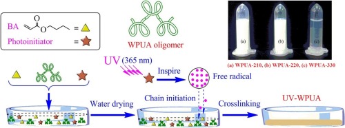 Environmentally friendly waterborne polyurethane-acrylate (WPUA) oligomers and ultraviolet curing WPUA films (UV-WPUA) were prepared. The thermal stability, solvent-resistance and mechanical properties of the films were investigated. FT-IR and photo-DSC methods were used to investigate the photopolymerization kinetics of the UV-WPUA films. The results showed that UV-curing films offered the optimum combination of properties when the polyether polyol (NJ-330), isophorone diisocyanate (IPDI), hydroxyethyl methyl acrylate (HEMA) and dimethylolbutanoic acid (DMBA) were used as the raw materials and the mass ratio of oligomer: monomer butyl acrylate (BA): photoinitiator was fixed at 66:30:4. Reaction kinetics of different photoinitiators systems were calculated by Kissinger equation and Crane equation, thus providing a theoretical guidance for the optimization of diluent and photoinitiator in UV-curing coating industry.
