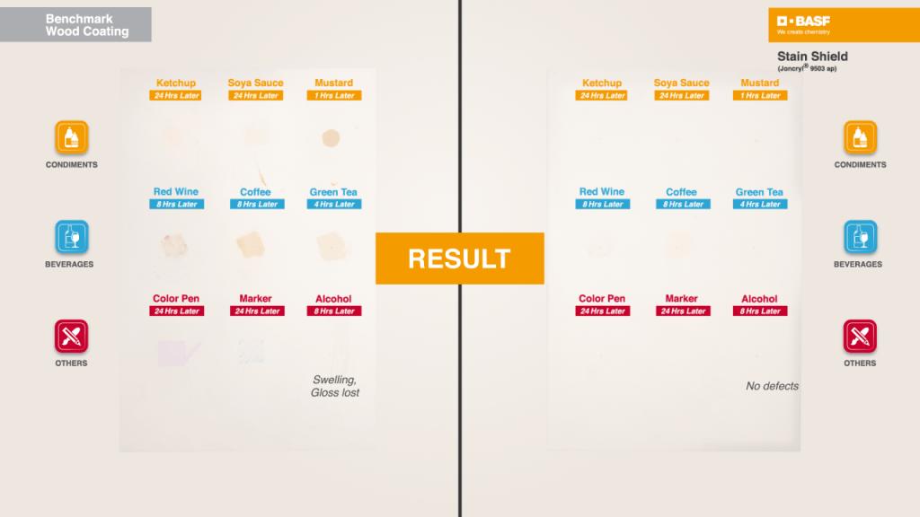 A side-by-side experiment of 9 common stains proves that BASF’s Stain Shield is superior against your typical benchmark, with potentially more than 24 hours of durability and stain resistance.