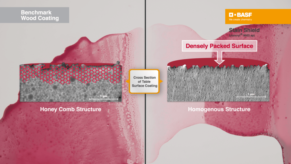 Stain Shield’s technology provides a highly homogeneous structure for the wood coating that creates a densely packed surface. And therefore, substances could be blocked from our advanced coatings and avoid forming stain.