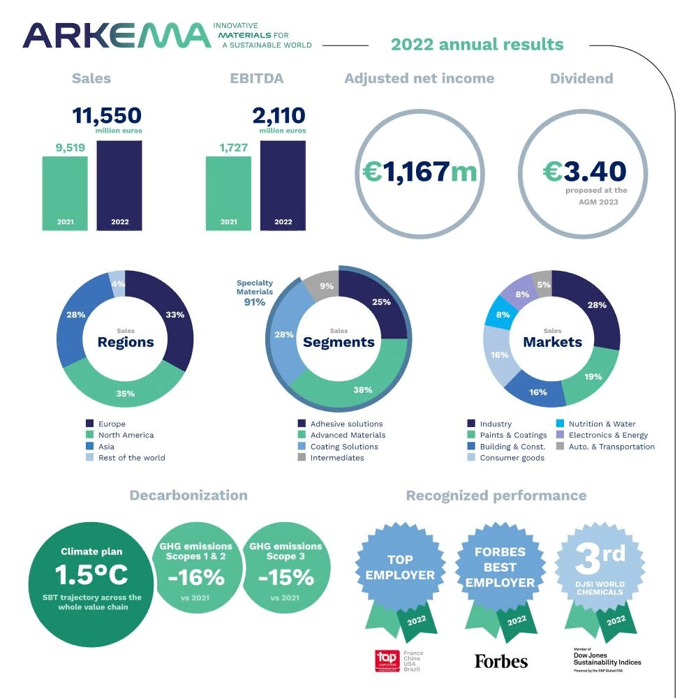 In this context, Arkema aims to achieve in 2023 an EBITDA of around €1.5 billion to €1.6 billion and maintain a high EBITDA to cash conversion rate of over 40%.
